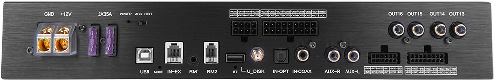 Формат «процесор + 12-канальний підсилювач» автоматично дав серйозну свободу в підключенні. Модель спокійно приймає сигнал практично з будь-якого джерела: 14 високорівневих входів для штатних систем, низькорівневі RCA, оптика, коаксіал, Bluetooth, USB-аудіокарта і навіть CD — процесор буквально «розуміє» все. На виході 12 каналів вбудованого посилення і 4 незалежних RCA для розширення системи або підключення додаткового обладнання.